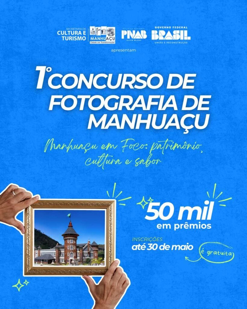 Estão abertas, até o dia 30 de maio, as inscrições para o 1º Concurso de Fotografia de Manhuaçu. Com o tema: “Manhuaçu em foco: Patrimônio, Cultura e Sabor”, esta é uma oportunidade para documentar a rica história de nossa cidade, destacando as vivências cotidianas e tradições que formaram nossa identidade ao longo de 147 anos.