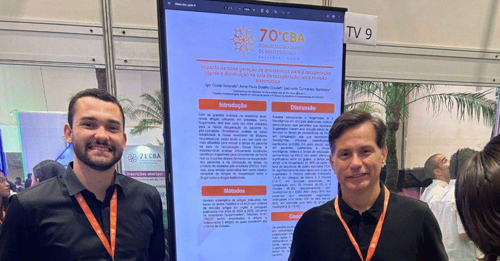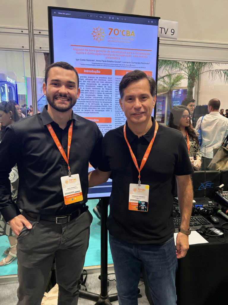 Os dois trabalhos, intitulados “Impacto da nova geração de anestésicos para a recuperação rápida e diminuição na sala de recuperação: uma revisão sistemática” e “Síndrome de Hipotensão Supina na Gestante: conduta anestésica e desfechos perioperatórios”, são dois estudos em revisão de literatura, preparados especificamente para submissão ao Congresso Nacional de Anestesiologia. Igor destaca que as contribuições de Leonardo Nominato como orientador foram fundamentais para os artigos terem sido aceitos para apresentação no evento. O anestesiologista também foi a Salvador para o Congresso.