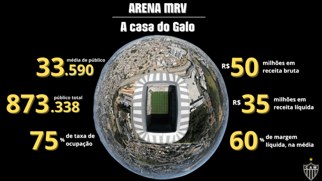 - Em 26 jogos, o total arrecadado de receita de bilheteria (bruto) é de R$ 50 milhões – média de 1,9 milhão de reais por jogo. O custo médio das partidas na Arena MRV, em 2024, é de apenas R$ 662 mil em 2024.