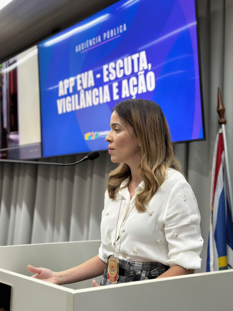 A delegada Carolina Bomfim Queiroga, responsável pela Delegacia de Atendimento à Mulher (DEAM-GV), explicou os detalhes do aplicativo EVA.