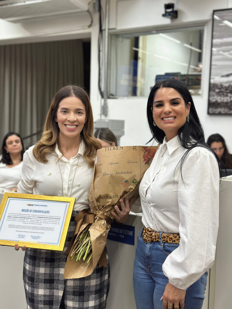 Delegada Carolina Bomfim Queiroga e a vereadora Fernanda Braz. Fotos: Divulgação Câmara de GV
