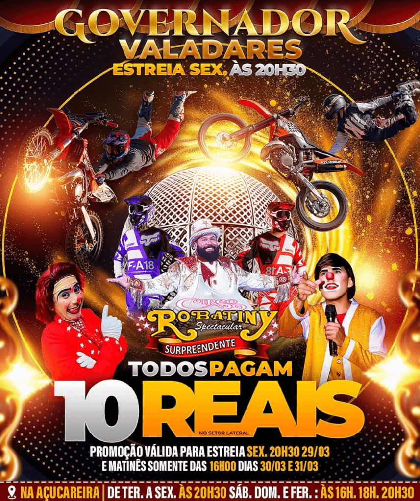 O Circo Robatiny Espetacular recebe apoio da Prefeitura de Valadares, por meio da Secretaria Municipal de Cultura, Esporte, Lazer e Turismo (SMCELT).