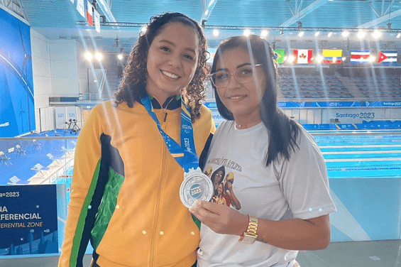 Pela primeira vez, Clédina conseguiu viajar para assistir a filha em um evento internacional. Nas arquibancadas do Centro Aquático, em Santiago, a mãe não esconde o orgulho, vestindo uma camiseta com fotos da atleta. "Hoje, vendo ela disputar uma grande competição, o que passa na minha cabeça é que valeu a pena lutar pela minha filha. Vejo que a semente que plantei lá atrás está dando frutos", comemorou.