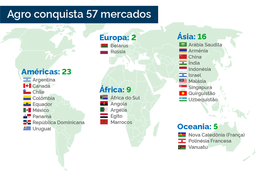 Nos últimos dez meses, o Brasil recebeu autorização para iniciar as exportações de produtos agropecuários para 57 novos mercados. As autorizações sanitárias enviadas por cada país parceiro são resultados do esforço do Ministério da Agricultura e Pecuária (Mapa) na elaboração de informações técnicas e nas negociações internacionais que culminaram no acordo de requisitos sanitários e fitossanitários que permitiram a exportação de novas mercadorias e parcerias em 2023.