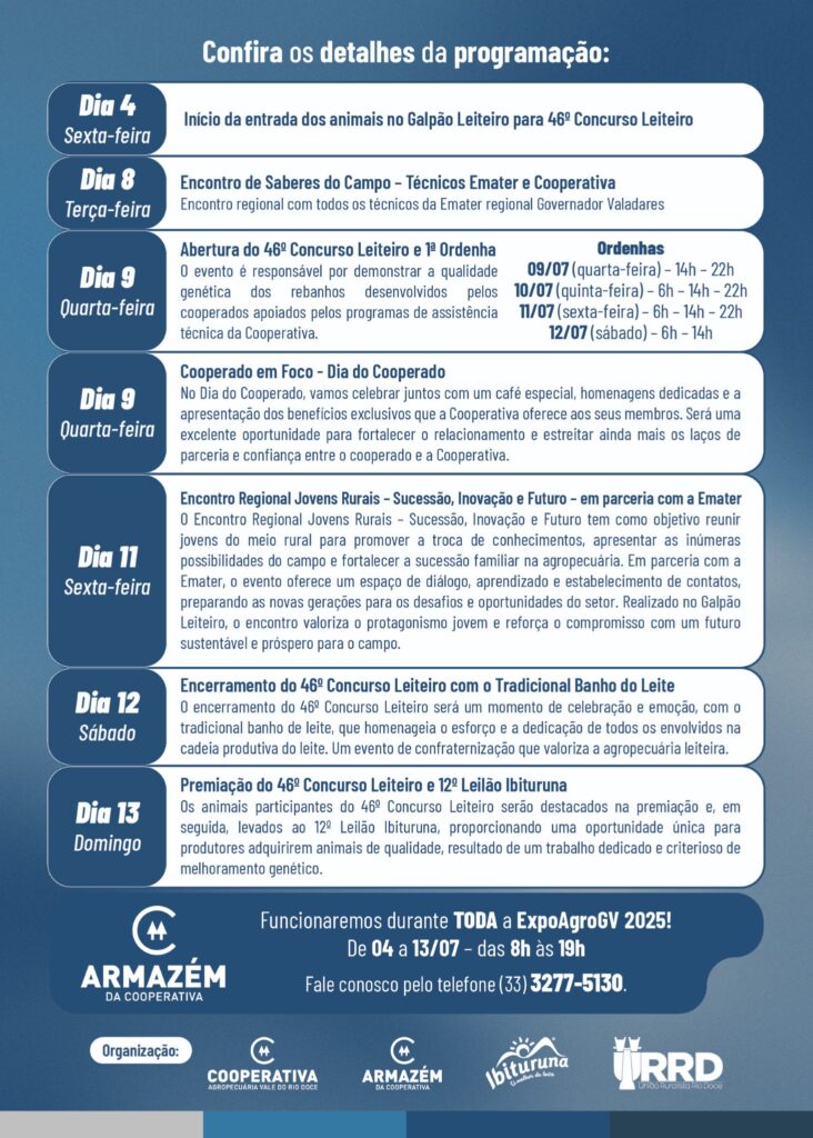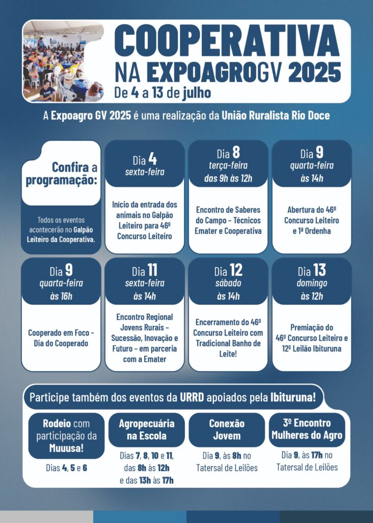 Durante todos os dias da ExpoAgroGV 2025, o estande da Cooperativa funcionará das 8h às 19h, com atendimento ao público, parceiros e cooperados. A Cooperativa também apoiará eventos promovidos pela União Ruralista Rio Doce (URRD), como o Rodeio com participação da Muuusa (dias 4, 5 e 6), o projeto Agropecuária na Escola (dias 7, 8, 10 e 11, das 8h às 12h e das 13h às 17h), o Conexão Jovem (dia 9, às 8h), e o 3º Encontro Mulheres do Agro (dia 9, às 17h), ambos no Tatersal de Leilões.