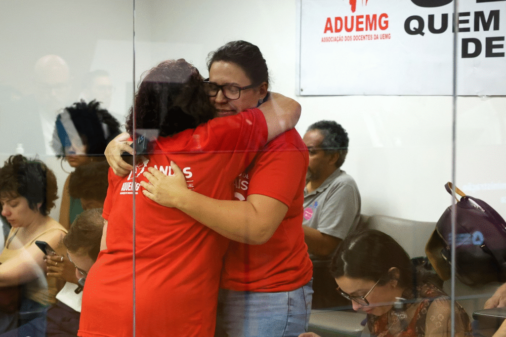 Servidores da Uemg comemoraram a retirada dos imóveis da universidade da lista do PL 3.733/25. Foto: Henrique Chendes ALMG