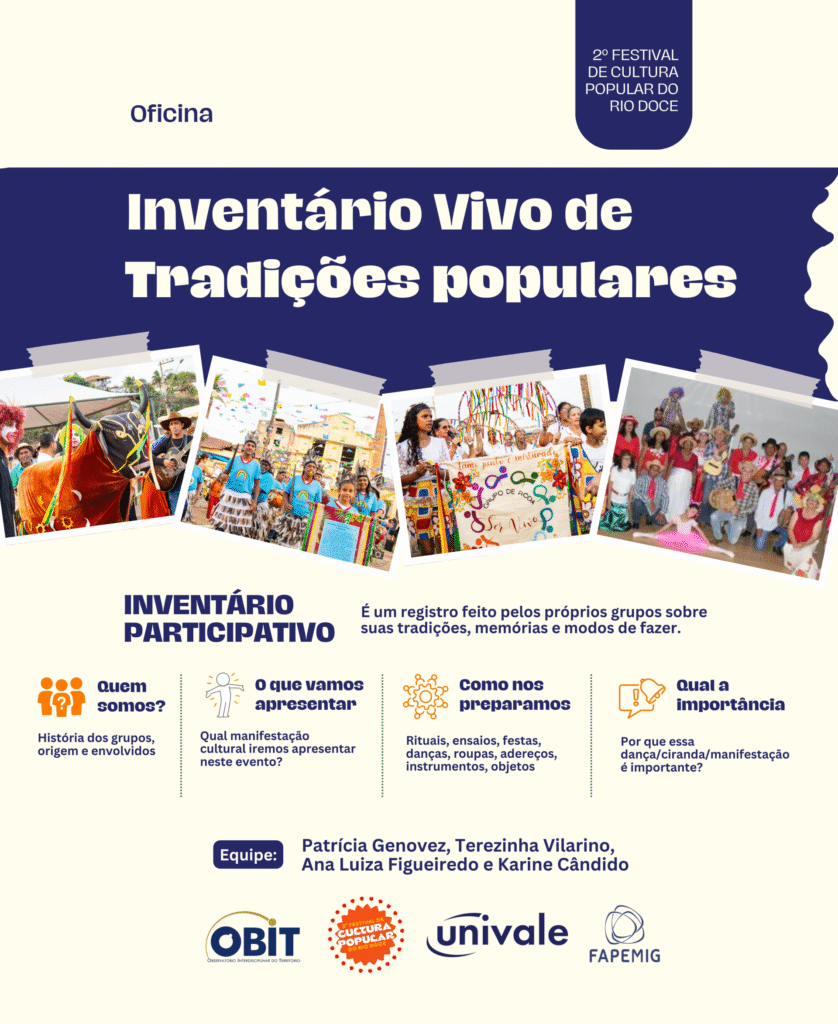 O 2º Festival de Cultura Popular do Rio Doce dá início à sua programação de oficinas com uma proposta inovadora e participativa: o Inventário Vivo das Tradições Populares. A atividade reúne grupos de Bumba-meu-boi, Folia de Reis, Caboclinhos e Cirandeiras em um processo coletivo de valorização e registro de suas próprias memórias, práticas e saberes.