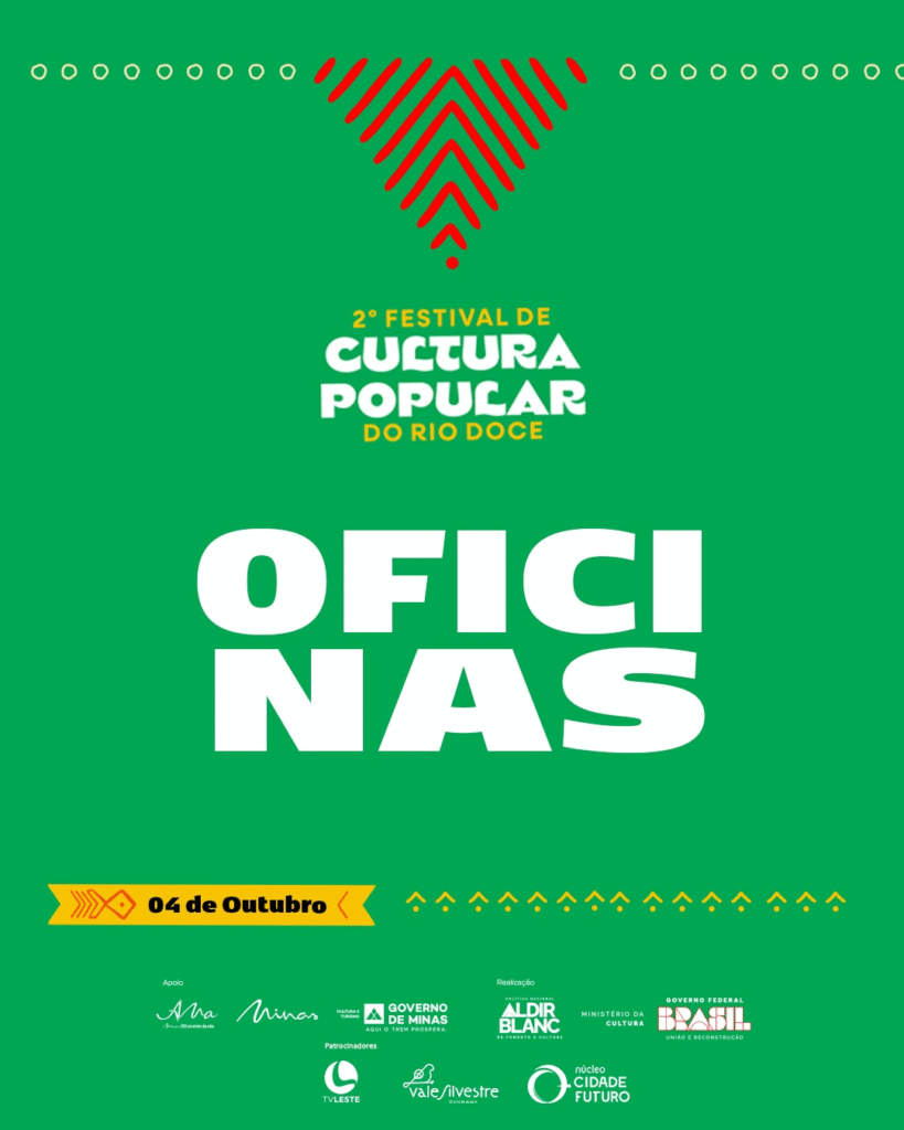 As inscrições para as oficinas serão realizadas de forma presencial, por ordem de chegada a partir das 14h30 durante o 2º Festival de Cultura Popular do Rio Doce que acontece no dia 04 de outubro, na Praça da Estação, em Governador Valadares. Entrada gratuita.