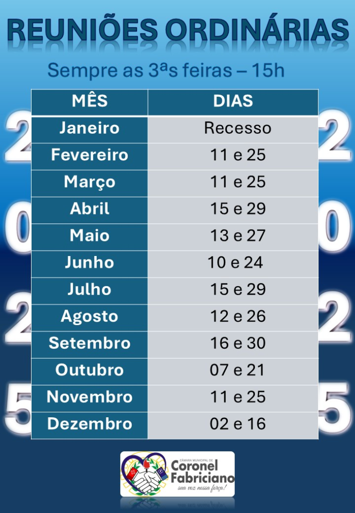 A Câmara Municipal de Coronel Fabriciano já definiu o calendário das reuniões ordinárias para este ano! As reuniões são momentos importantes para discutir e deliberar assuntos que impactam diretamente o dia a dia da nossa cidade e da nossa comunidade.