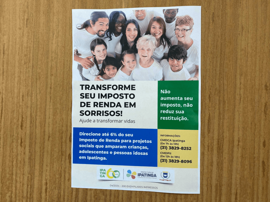 A Prefeitura de Ipatinga, por meio da Secretaria Municipal de Assistência Social (SMAS), deu início neste mês de abril a uma campanha para incentivar os contribuintes a destinarem parte do Imposto de Renda (IR) ao Fundo Municipal dos Direitos da Criança e do Adolescente e ao Fundo Municipal do Idoso, que repassam os valores a projetos que promovem cuidado, proteção e garantia de direitos para esse público.