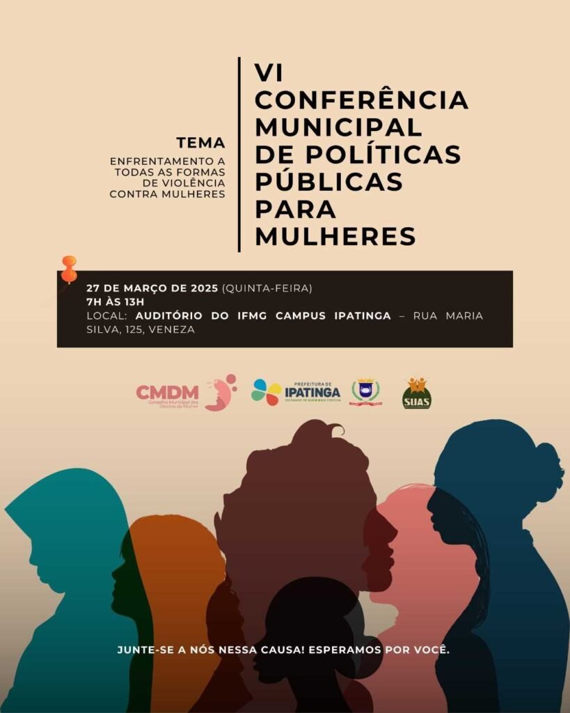 O Conselho Municipal dos Direitos da Mulher de Ipatinga (CMDM), por meio da Secretaria Municipal de Assistência Social (SMAS), promove na próxima quinta-feira (27), das 7h às 13h, a VI Conferência Municipal de Políticas Públicas para Mulheres.