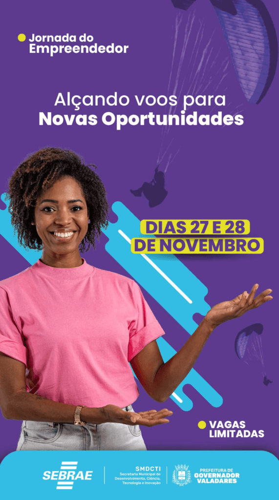 O empreendedorismo é um caminho permeado por descobertas, evoluções e desafios próprios. E para enriquecer ainda mais essa caminhada e promover aprendizado e atualização, a Prefeitura de Valadares, por meio da Secretaria Municipal de Desenvolvimento, Ciência, Tecnologia e Inovação (SMDCTI), em parceria com o Sebrae, realiza nos dias 27 e 28 de novembro, no Anexo I da Prefeitura (Fadivale), o evento Jornada do Empreendedor – Alçando Voos Para Novas Oportunidades.