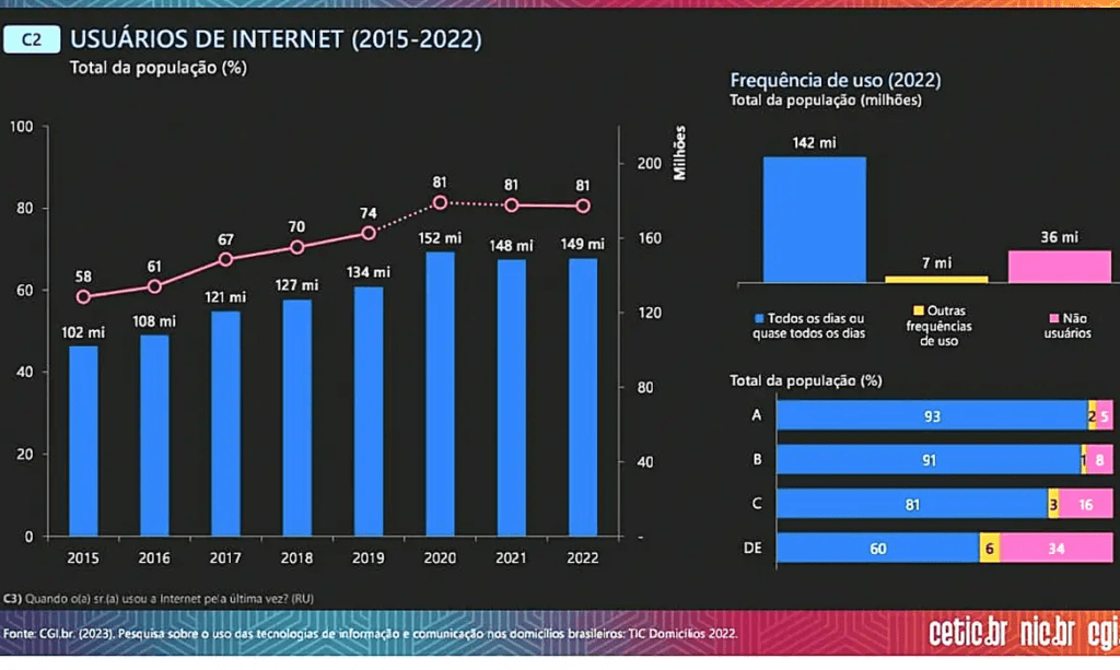 Apesar dos avanços, a pesquisa revela desigualdades classificadas como “marcantes” pela Cetic.br. Enquanto a internet está presente em 100% dos domicílios de classe A, por exemplo, o índice é de 68% nos lares das classes D e E.