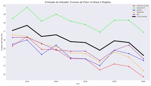 Já os adolescentes preocupam mais: há uma tendência crescente ao excesso de peso desde o início da série, em 2013, com uma pequena queda apenas entre 2021 e 2022.
