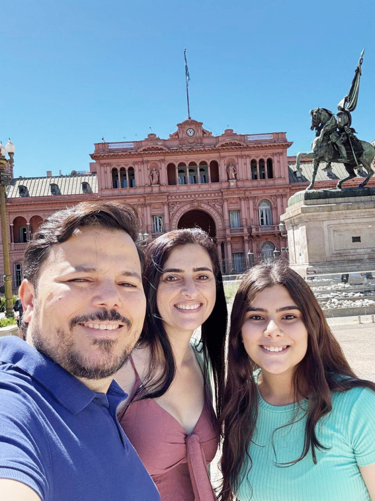 Jackson Lemos com Aline e Alice curtindo Buenos Aires, em frente a Casa Rosada.