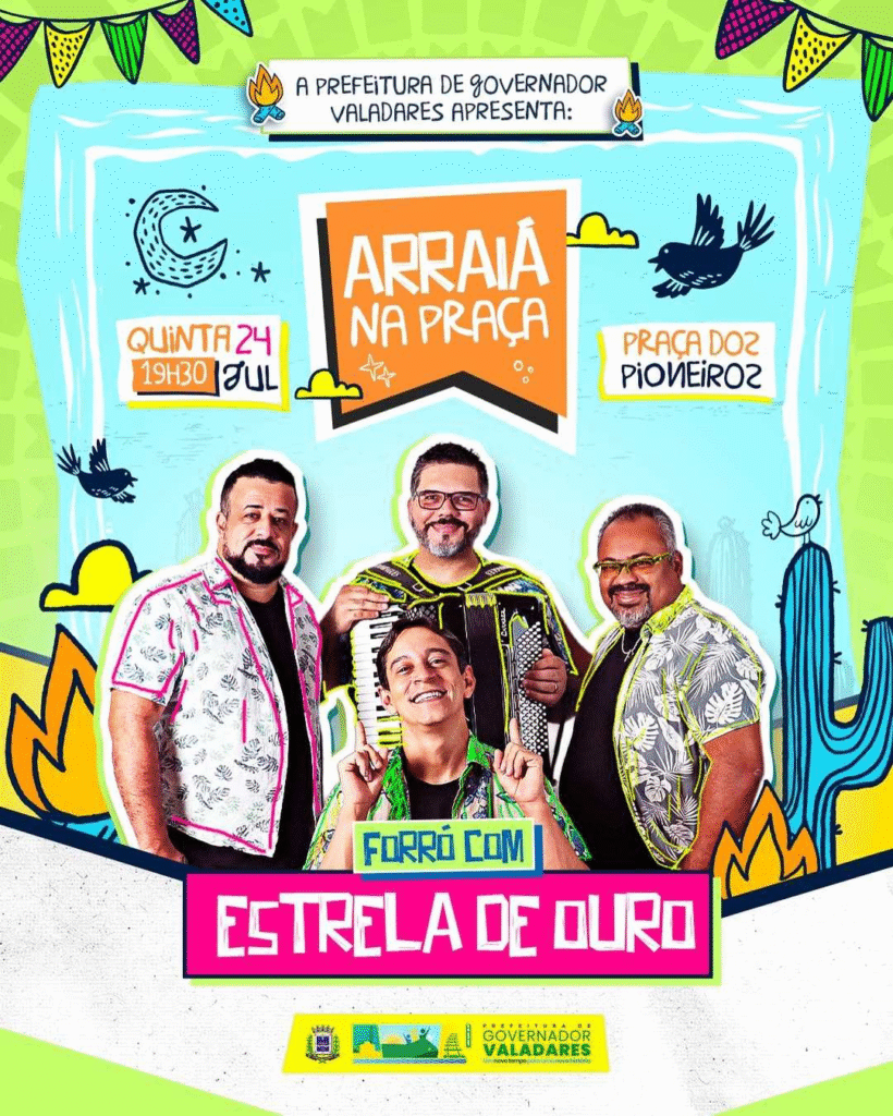 A Prefeitura de Valadares vai promover um grande Arraiá na Praça dos Pioneiros no dia 24 deste mês, a partir das 19h30. A festa, que tem a entrada gratuita, vai ter show com a banda de forró Estrela de Ouro, comidas típicas, danças e aquele clima gostoso de São João que a gente ama.