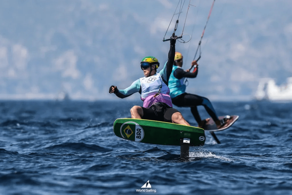 Bruno Lobo na semifinal da Fórmula Kite nos Jogos Olímpicos Paris 2024. FOTO: World Sailing/Lloyd Images