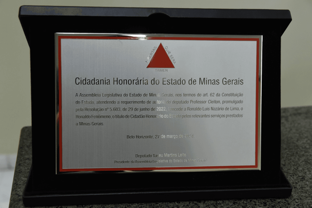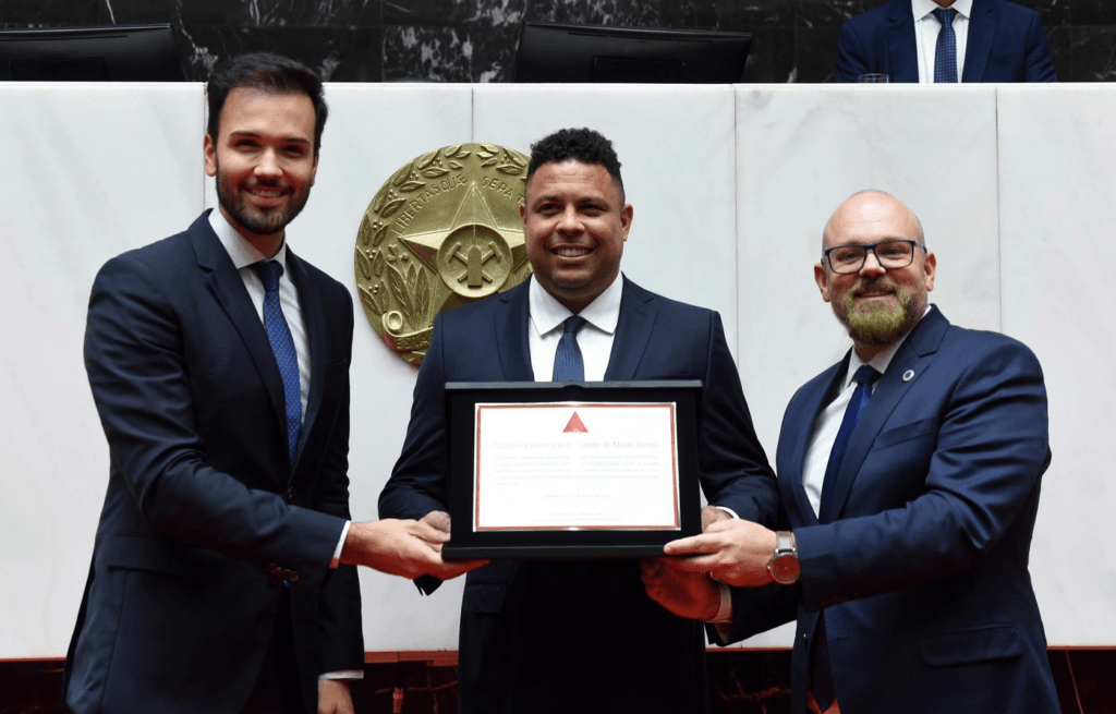 Ronaldo recebeu de ambos os parlamentares o título de cidadão honorário de Minas Gerais. Também acompanharam a solenidade os deputados Sargento Rodrigues (PL) e Coronel Henrique (PL) e as deputadas Ana Paula Siqueira (Rede) e Ione Pinheiro (União).
