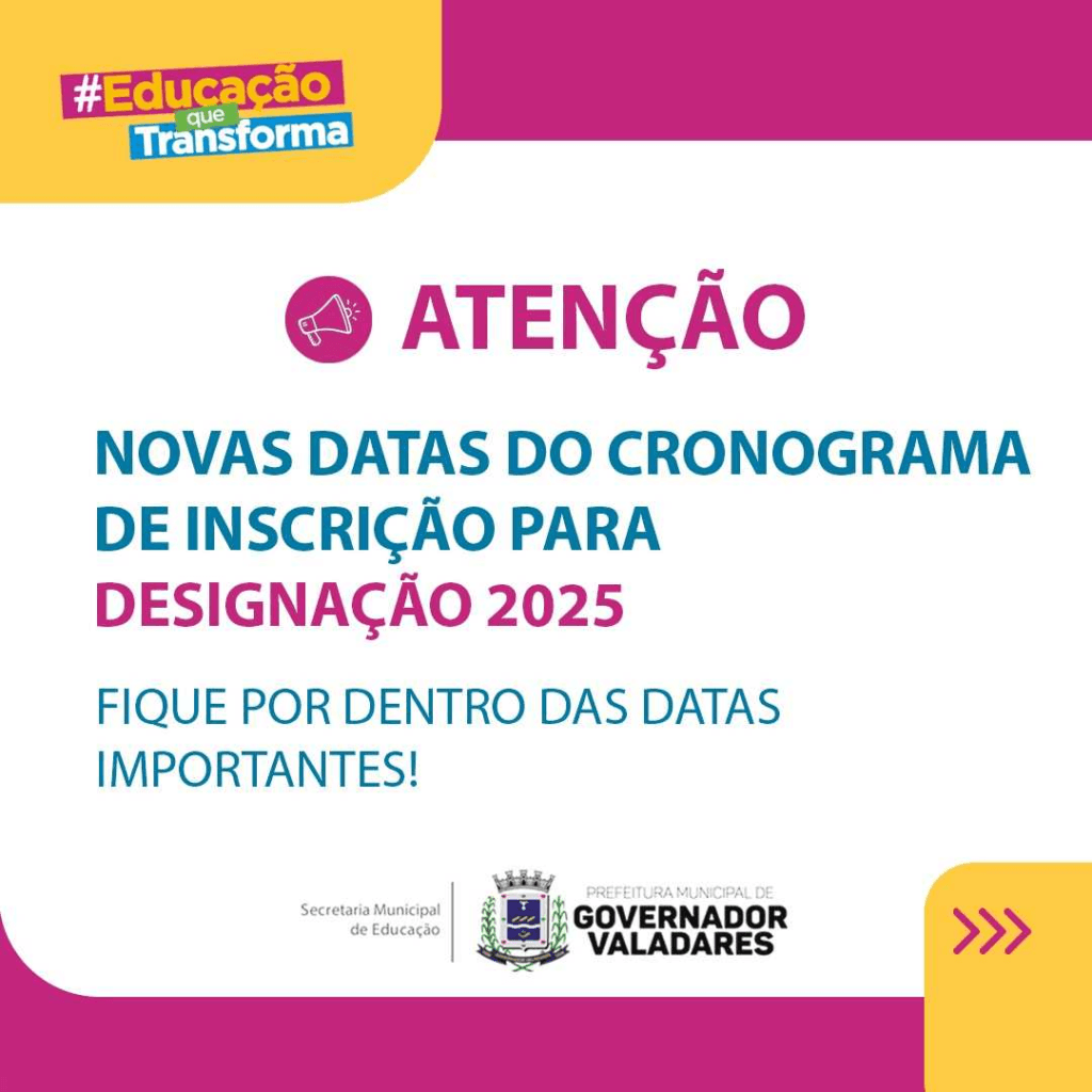 A Prefeitura de Valadares, por meio da Secretaria Municipal de Educação (SMED), informa que o sistema de inscrições para a designação do ano de 2025 já está funcionando normalmente.