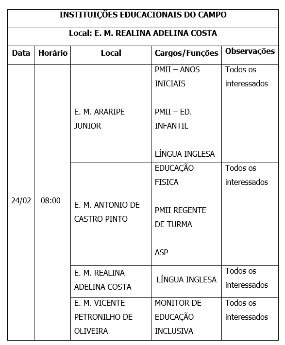 A Secretaria Municipal de Educação (SMED) informa que, na próxima segunda-feira (24), realizará mais uma chamada de designação para o exercício de função pública nas Unidades Escolares do campo.