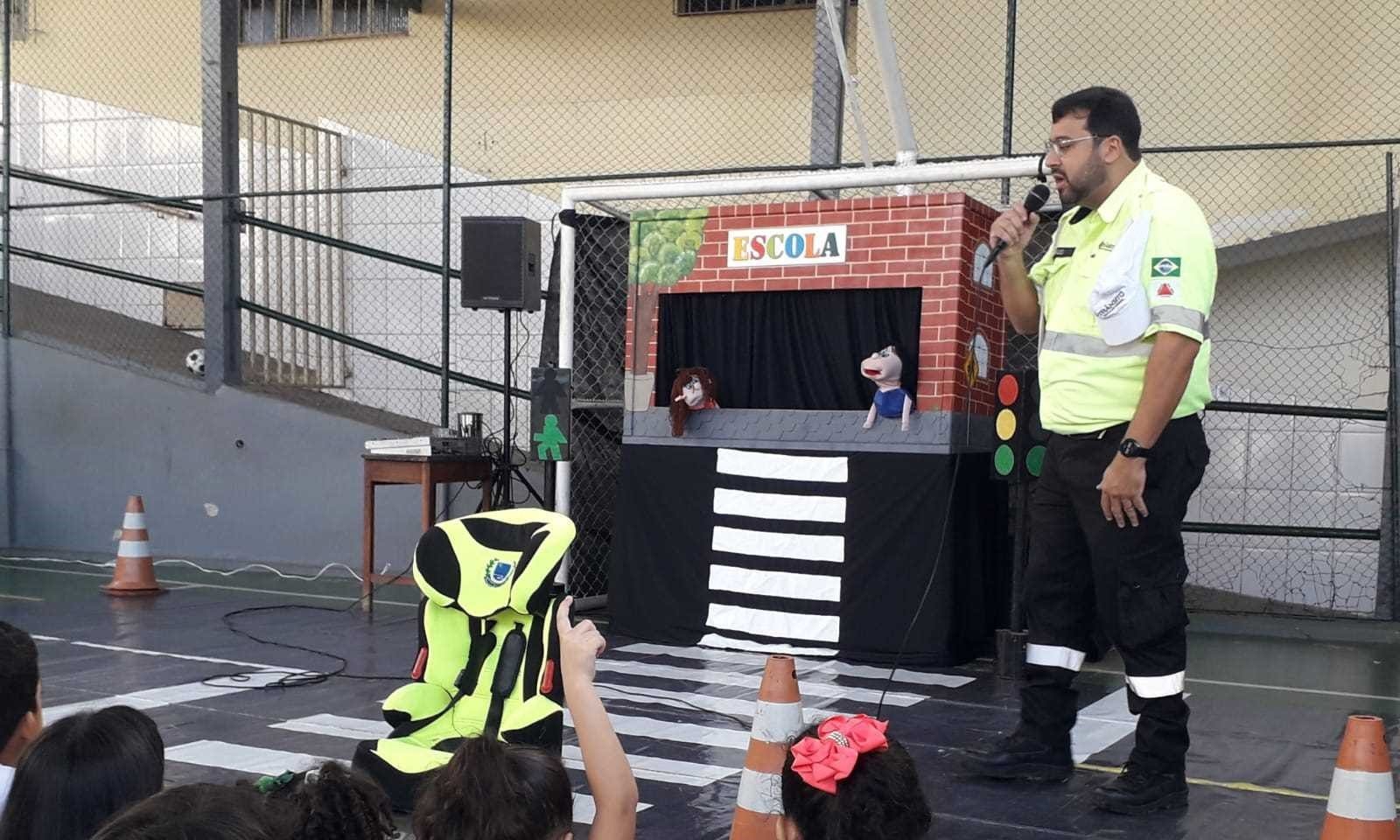 Com o auxílio de fantoches e também do mascote Edu, os agentes levaram orientações relacionadas à segurança no trânsito, como atravessar a rua, sentar no banco traseiro do carro, usar a cadeirinha e o cinto de segurança, dentre outros.