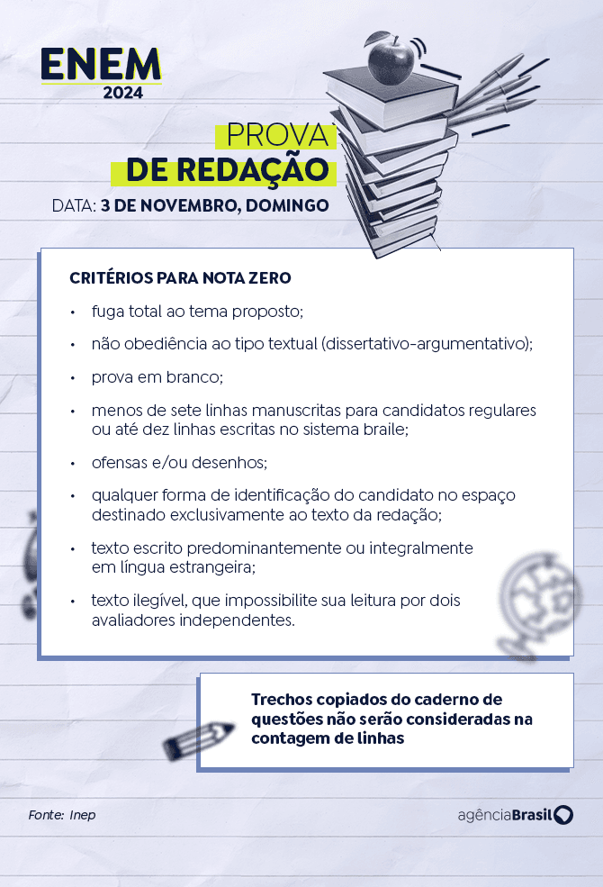 Entre os critérios que conferem nota zero estão fuga ao tema, texto com até sete linhas, trecho deliberadamente desconectado do tema, desobediência à estrutura dissertativo-argumentativa e desrespeito à seriedade do exame.